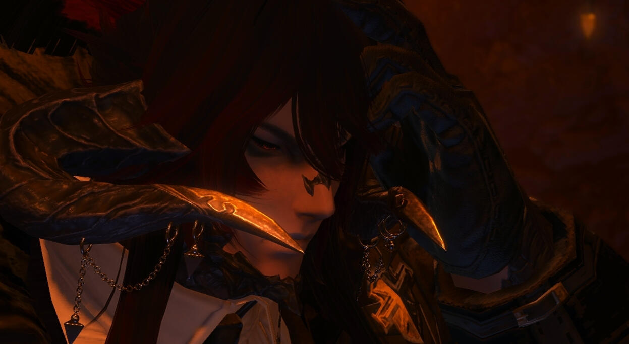 notable features. miqo'te-like ears and tail, xaela horns/scales. built like a mountain.